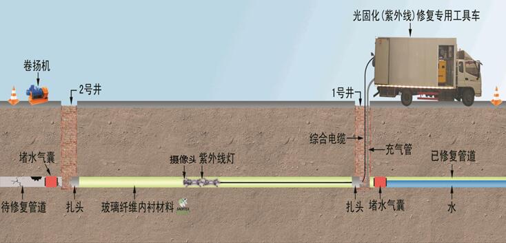 紫外線光固化修復(fù)UV-CIPP技術(shù)是非開挖修復(fù)原位固化法中的一種,住房和城鄉(xiāng)建設(shè)部頒布的行業(yè)標(biāo)準(zhǔn)《城鎮(zhèn)排水管道非開挖修復(fù)更新工程技術(shù)規(guī)程》(CJJ/T210-2014)中將原位固化法定義為采用牽拉方式將浸漬樹脂的內(nèi)襯管置入原有管道內(nèi),固化后形成管道內(nèi)襯的修復(fù)方法。紫外線光固化技術(shù)是將玻璃纖維編制成軟管浸漬樹脂,然后將其拉入原有管道內(nèi)充氣擴(kuò)張緊貼原有管道,在紫外光的作用下使樹脂固化形成具有一定強(qiáng)度的內(nèi)襯管的原位固化法。